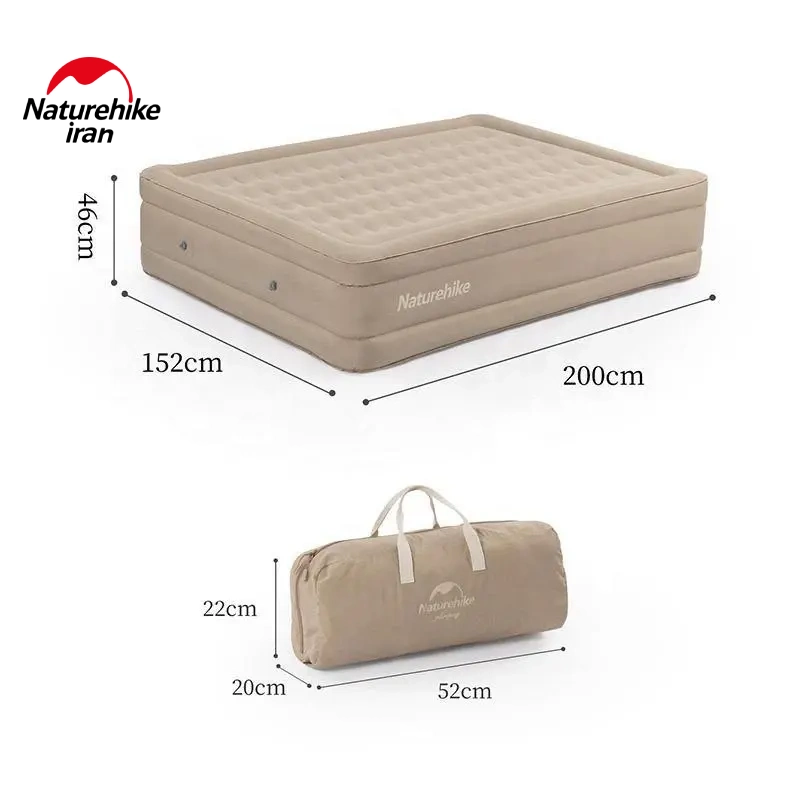 با ابعاد باز شده ۲۰۰ × ۱۵۲ × ۴۶ سانتیمتر، فضای کافی برای دو نفر بزرگسال فراهم میشود و حس خواب روی تخت واقعی را تجربه خواهید کرد. در حالت جمعشده، ابعاد کوچک ۵۲ × ۲۰ × ۲۲ سانتیمتر و وزن فقط ۴.۶ کیلوگرم باعث میشود بتوانید بهراحتی آن را در صندوق خودرو، کوله یا چمدان خود جا دهید.
