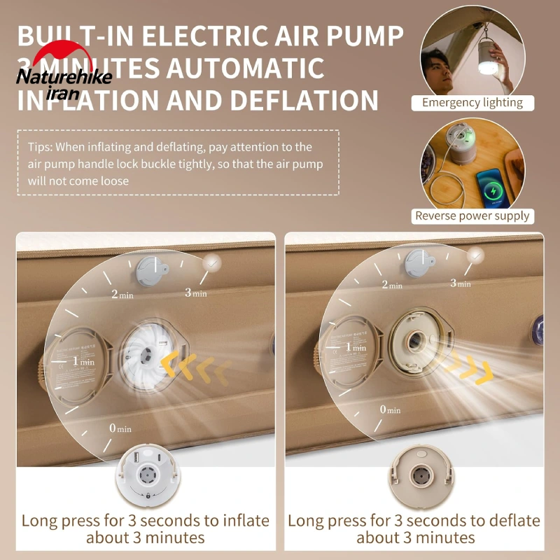 یکی از ویژگیهای برجسته CNH22DZ026، پمپ باد داخلی با باتری لیتیومی قابل شارژ ۴۵۰۰ میلیآمپر است. این پمپ امکان باد کردن سریع و بدون دردسر تشک را فراهم میکند و نیازی به ابزار جانبی ندارد. باتری قابل شارژ داخلی، توانایی استفاده چندباره بدون شارژ مجدد را دارد و این موضوع آن را برای سفرهای چندروزه و مناطق بدون برق بسیار مناسب میکند. همچنین، قابلیت تخلیه سریع باد و جمعآوری آسان، جابجایی و نگهداری تشک را ساده کرده است.