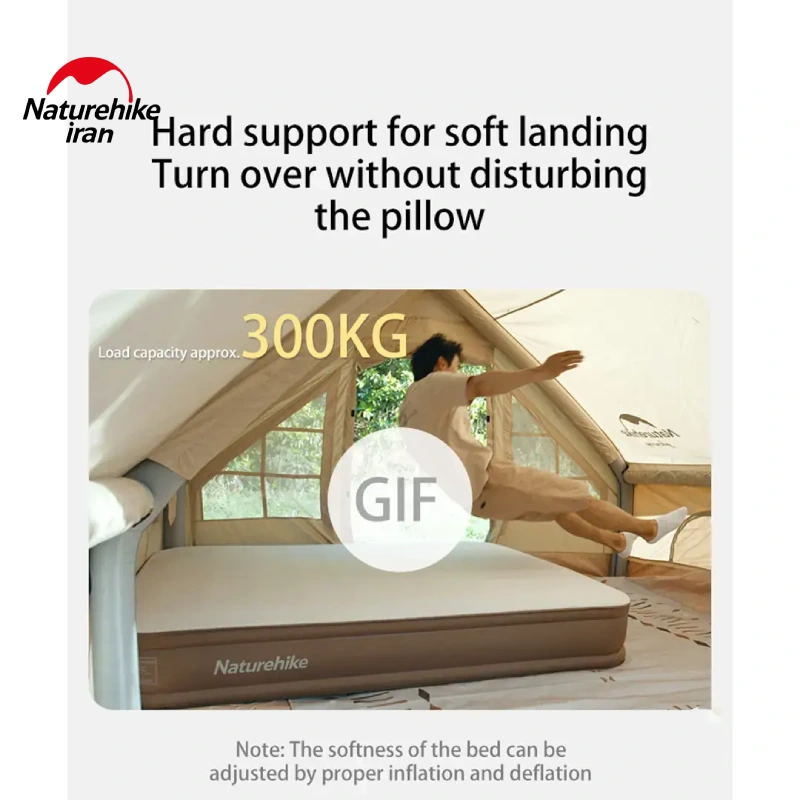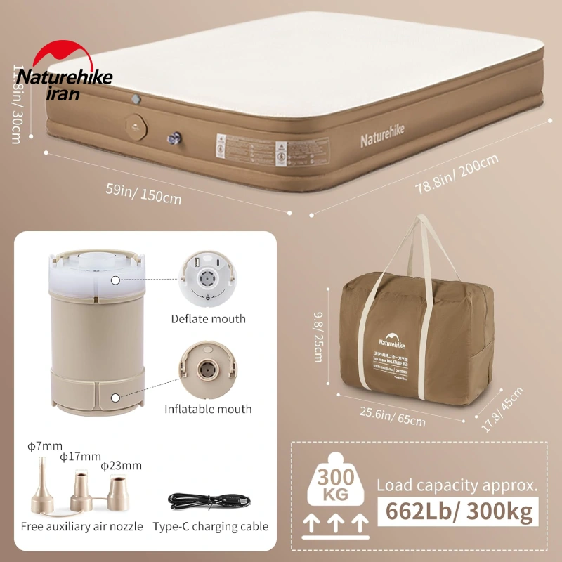 تشک بادی ۲ نفره نیچرهایک مدل CNH22DZ026، همراه مطمئن شما در هر سفر و کمپینگ است. طراحی ارگونومیک با ارتفاع ۳۰ سانتیمتری و ابعاد ۲۰۰ × ۱۵۰ سانتیمتر، تجربه خوابی راحت و آرام را برای دو نفر فراهم میکند. رویه نرم از الیاف پلیاستر و هسته داخلی اسفنجی با کشسانی بالا، پشتیبانی کامل بدن و نرمی بینظیر ارائه میدهد. پمپ داخلی با باتری لیتیومی قابل شارژ، باد کردن تشک را سریع و آسان میکند و بدون نیاز به تجهیزات اضافه آماده استفاده است. وزن ۱۱ کیلوگرمی و بستهبندی جمعوجور، حمل و نگهداری آن را راحت کرده است. با ظرفیت تحمل ۳۰۰ کیلوگرم، CNH22DZ026 مناسب استفاده دو نفره در کمپینگ، چادر، فضای باز و حتی خانه است. ترکیبی بینظیر از راحتی، دوام و کاربرد چندمنظوره که هر ماجراجو و خانوادهای به آن نیاز دارد.