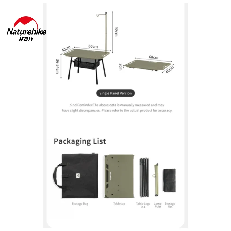 میز نیچرهایک CNK2450JJ025 در دو رنگ سبز و مشکی عرضه میشود که رنگ سبز برای هماهنگی با محیطهای طبیعی و رنگ مشکی برای ظاهر مدرن و کلاسیک مناسب است. کیف حمل همراه محصول، حمل و نگهداری میز را آسان میکند و امکان استفاده سریع در هر شرایطی را فراهم میسازد.