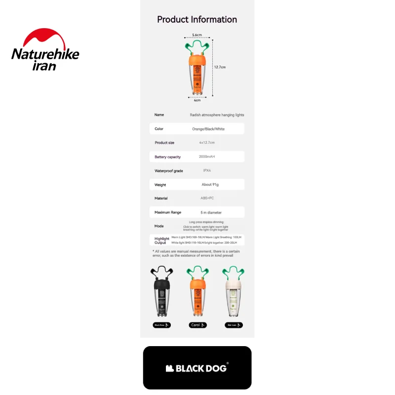 چراغ آویز BLACK DOG مدل CBD2450ZM014 یک ابزار کوچک اما فوق‌العاده کارآمد برای هر طبیعت‌گرد و عاشق سفر است. این چراغ با نوردهی 20 تا 200 لومن، فضای اطراف شما را کاملاً روشن و یکدست می‌کند؛ چه داخل چادر باشید، چه در محوطه کمپ یا حتی زمانی که در خودرو آفرودی‌تان استراحت می‌کنید. نور دو رنگ زرد و سفید آن اجازه می‌دهد بسته به شرایط محیطی و سلیقه‌تان، بهترین حالت نور را انتخاب کنید.
