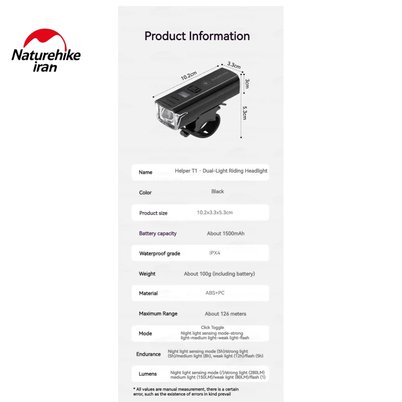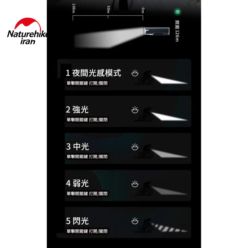 چراغ دارای پنج حالت نور است: نور خودکار شب، نور قوی، نور متوسط، نور ضعیف و حالت فلش. حالت خودکار شدت نور را با توجه به روشنایی محیط تنظیم میکند و در مصرف باتری صرفهجویی میکند. نور قوی با شدت 280 لومن مسیرهای تاریک را بهطور کامل روشن میکند، نور متوسط 150 لومن برای مسیرهای نیمهروشن شهری مناسب است و نور ضعیف با 80 لومن تا 12 ساعت دوام دارد. حالت فلش نیز برای افزایش دید و هشدار به رانندگان طراحی شده است. برد نور 126 متر، دید واضح و ایمنی بیشتر در مسیرهای شبانه و پرخطر را فراهم میکند.